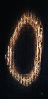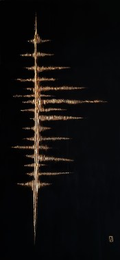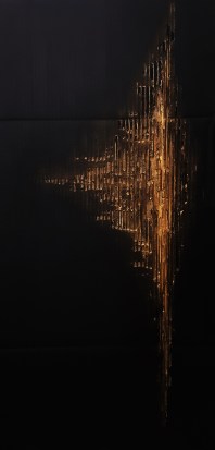 L’opera vuol sottolineare la verticalità, ovvero il senso del sacro e del dono che provengono da una dimensione alta. Una lama luminosa, che come una spada di san Michele squarcia l’oscurità, rappresentata da un triangolo d’oro lungo e stretto, ovvero una trinità, che non rimane distante e sospesa, ma si allunga per avvicinarsi fino a noi. L’opera è realizzata seguendo le proporzioni della sezione aurea, acrilico su cartone da imballo, un materiale povero e fragile che una volta lavorato tramite strappi (rip-out) e/o brasature, ne viene trasfigurata la forma ed è accolto nello spazio sacro.